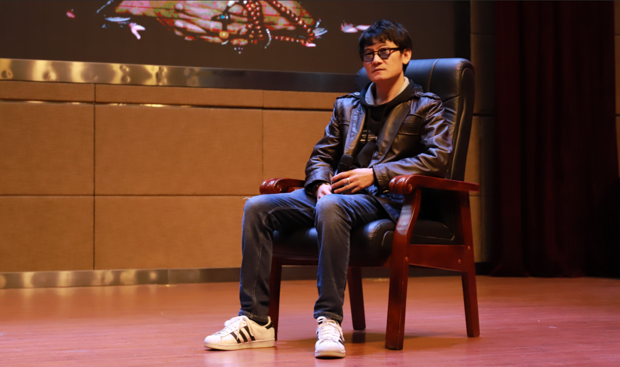 导演大飞及艺术总监丁建国两位主创人员,在交流环节向大家讲述了整部影片从剧本构思、前期筹备到实地拍摄的整个创作流程,使在场师生对整部影片有了更加深入的了解。大飞导演更是就片中道具场景等的布置,由浅入深的分享了自己创作电影的心路历程。
