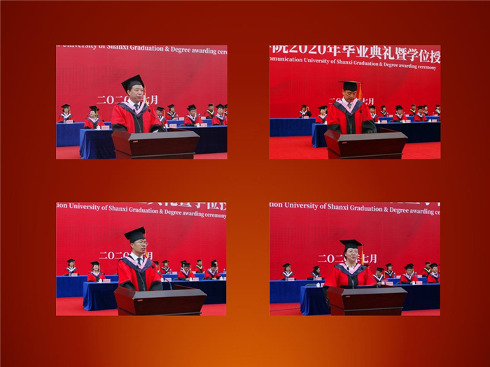李伟表示,四年来,同学们在“山传”逐梦青春,你们收获知识、增长智慧、结识朋友、开拓视野、成长为自信、自立的“山传”人。在疫情防控期间,同学们充分运用 “互联网+”手段,参加网络学习,与导师“连线答辩”,积极参与网络“云求职”,以一系列创新方式为自己在“山传”的学习生活画上了完美的句号。有不少同学考取了硕士研究生,选择了继续求学,还有更多的同学选择了奔赴祖国各地,到人民最需要的地方放光发热。为在新冠肺炎疫情中以各种方式勇敢加入战“疫”第一线的山传人点赞。